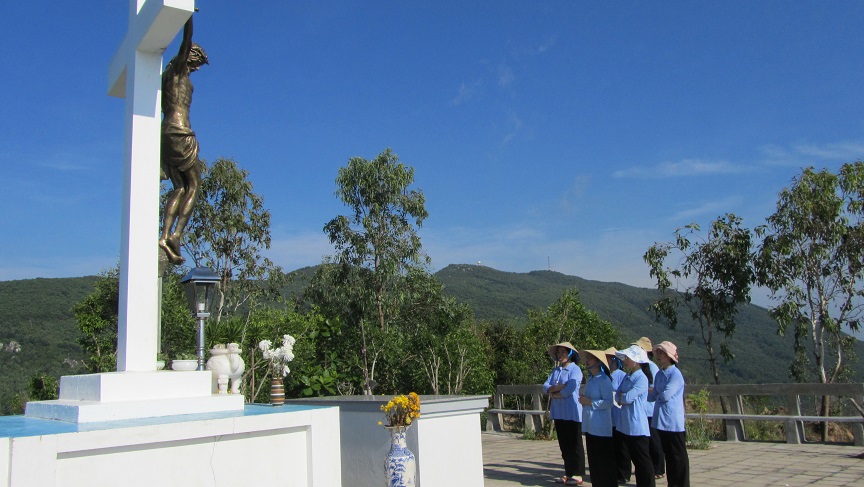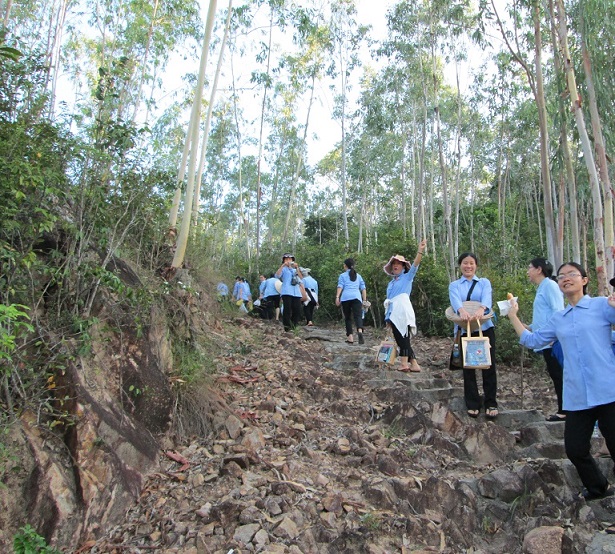 Cuộc viếng thăm Mẹ Qui Hòa qua 14 chặng đàng Thánh Giá bắt đầu. Từng bậc thang bước lên như một đóa hồng dâng lên Mẹ, mỗi chặng đàng Thánh giá xuất hiện làm chị em cảm thấy vui hơn vì đoạn đường gặp Mẹ đang được rút ngắn dần. Mặc dù mồ hôi nhễ nhại dưới nắng hè gay gắt của tháng 5, tưởng chừng làm chùng bước chân của chị em, nhưng chị em động viên nhau, sát cánh bên nhau từng bước tiến về hướng núi, nơi ấy Mẹ đang đứng chờ đoàn con đang háo hức dâng lên Mẹ những hy sinh, những bài hát đong đầy tâm tình yêu mến Mẹ được vang lên suốt cuộc hành trình, tất cả như góp thêm sức mạnh và phấn khởi để đôi chân chị em tiếp tục bước nhanh lên đỉnh núi.
