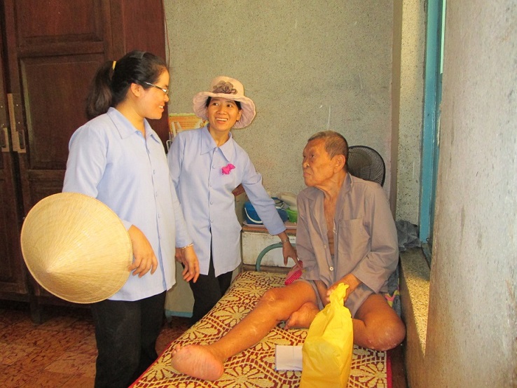 Sau vài phút chào thăm, chị em ghé thăm các bệnh nhân phong cùng với những phần quà được góp nhặt từ những hy sinh qua các bữa ăn chay trong các ngày thứ 6 hàng tuần và từ sự giúp đỡ của quý ân nhân. Chị em đến từng phòng thăm hỏi các bệnh nhân đang điều trị tại đây. Hầu hết các bệnh nhân đều bị khiếm khuyết một phần thân thể do di chứng của cơn bệnh để lại.