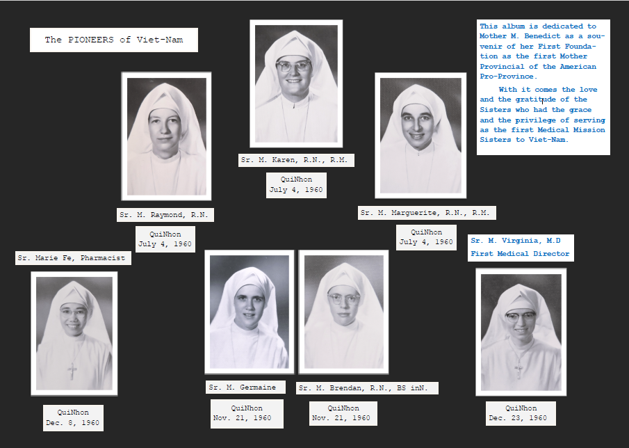 Tại Giáo phận Qui Nhơn, dấu ấn của Dòng Nữ Tu Thừa Sai Y Viện gắn liền với Bệnh viện Thánh Gia, khởi sự năm 1961 theo lời mời gọi của Đức cha Phêrô Maria Phạm Ngọc Chi. Trong suốt những năm chiến tranh khốc liệt, các nữ tu đã tận tâm phục vụ bệnh nhân, bất kể lương giáo, đem đến cho nhiều người niềm an ủi và hy vọng sống. Dù phải rời Qui Nhơn từ năm 1975, nhưng ký ức về các nữ tu “thiên thần áo trắng” vẫn in đậm nơi tâm trí bao người dân. Năm 2022, Hội Dòng đã trở lại Việt Nam với cộng đoàn Đức Mẹ Hy Vọng, hiện diện và phục vụ tại Tổng Giáo phận Sài Gòn.
