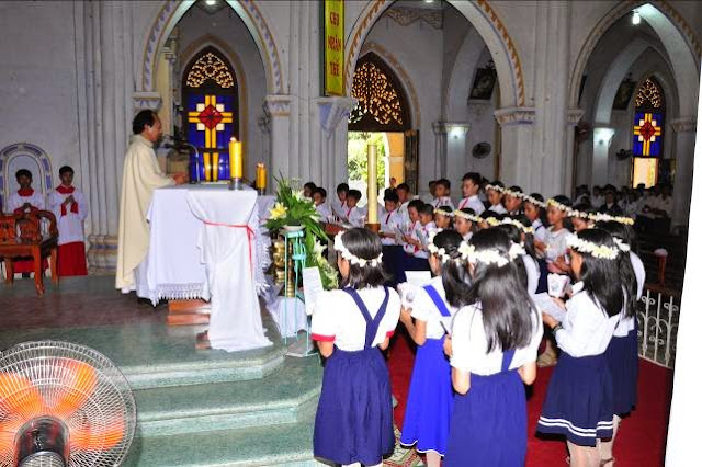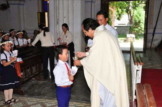 Đặc biệt, trong Thánh lễ 9 giờ sáng hôm nay, 31 em trong những trang phục mới và xinh đẹp, khuôn mặt hân hoan rạng ngời, được rước Chúa vào lòng lần đầu tiên. Niềm hân hoan vui mừng tràn ngập tâm hồn các em đã chuyền sang quý phụ huynh, cả cộng đoàn và quý Soeurs, các Giáo lý viên cùng với Cha Sở.