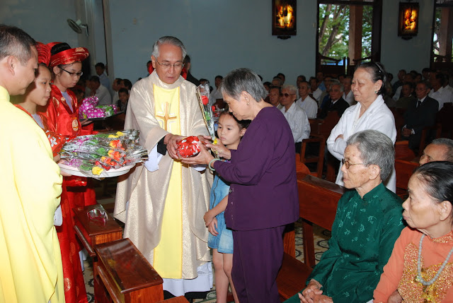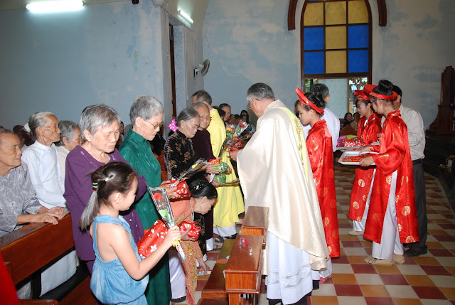Đặc biệt trong ngày mồng hai tết cầu nguyện cho cha mẹ là người có công sinh thành dưỡng dục: “Uống nước nhớ nguồn, làm con luôn thảo kính mẹ cha.”. Đây chính là nét riêng mà “ngày đầu xuân bao người đi xa cũng về với gia đình, cũng về với ân tình ngất ngây với người yêu mến, dâng đến lòng mẹ cha bông hoa là lòng biết ơn” và việc làm này được thể hiện qua sự chúc thọ cha mẹ từ 70 tuổi trở lên. Hiện trong giáo xứ có trên 170 người nhưng hiện diện trong thánh lễ khoảng hơn 100 người. Số còn lại vì lý do sức khỏe không tham dự được. Sáng nay, cha sở Phêrô Đặng Son cùng với hai cha Phêrô Võ Tá Khánh và Giuse Võ Tá Hoàng cũng là người con của giáo xứ đã tặng hoa, quà và bao lì xì cho các cụ, trong khi cả cộng đoàn phụng vụ hát vang “Xin Chúa í a chúc lành cho đời cha mẹ của con, công ơn là như núi non dưỡng nuôi con bao ngày vuông tròn”