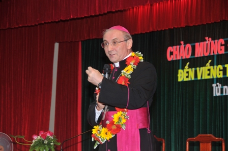 Thật là một niềm vinh dự khi được đón tiếp Đức Tổng lần thứ hai tại giáo phận Qui Nhơn này của chúng con, mặc dù là một giáo phận nhỏ bé nhưng đã là nguồn gốc của nhiều giáo phận miền Trung và Tây Nguyên. Đây không chỉ là nguồn gốc phát sinh mà còn là nơi qui tụ đúng như tên gọi Qui Nhơn nói lên ước vọng của người xưa, như một bài thơ đã giải thích:
