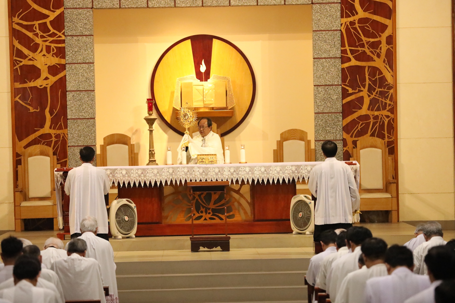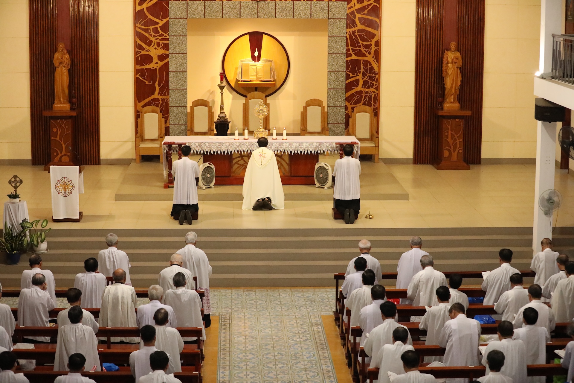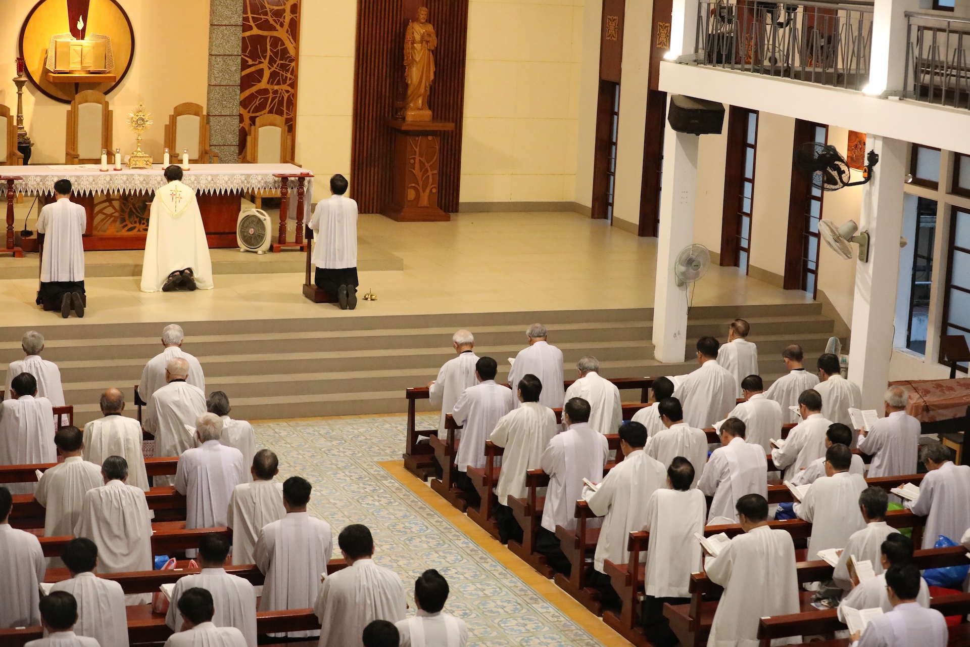 Tiếp đó, lúc 17 giờ 30, quý cha quy tụ tại nhà nguyện để đọc Kinh Chiều và Chầu Thánh Thể. Buổi tối, lúc 19 giờ 45, quý cha lần chuỗi chung, xét mình và đọc kinh tối.