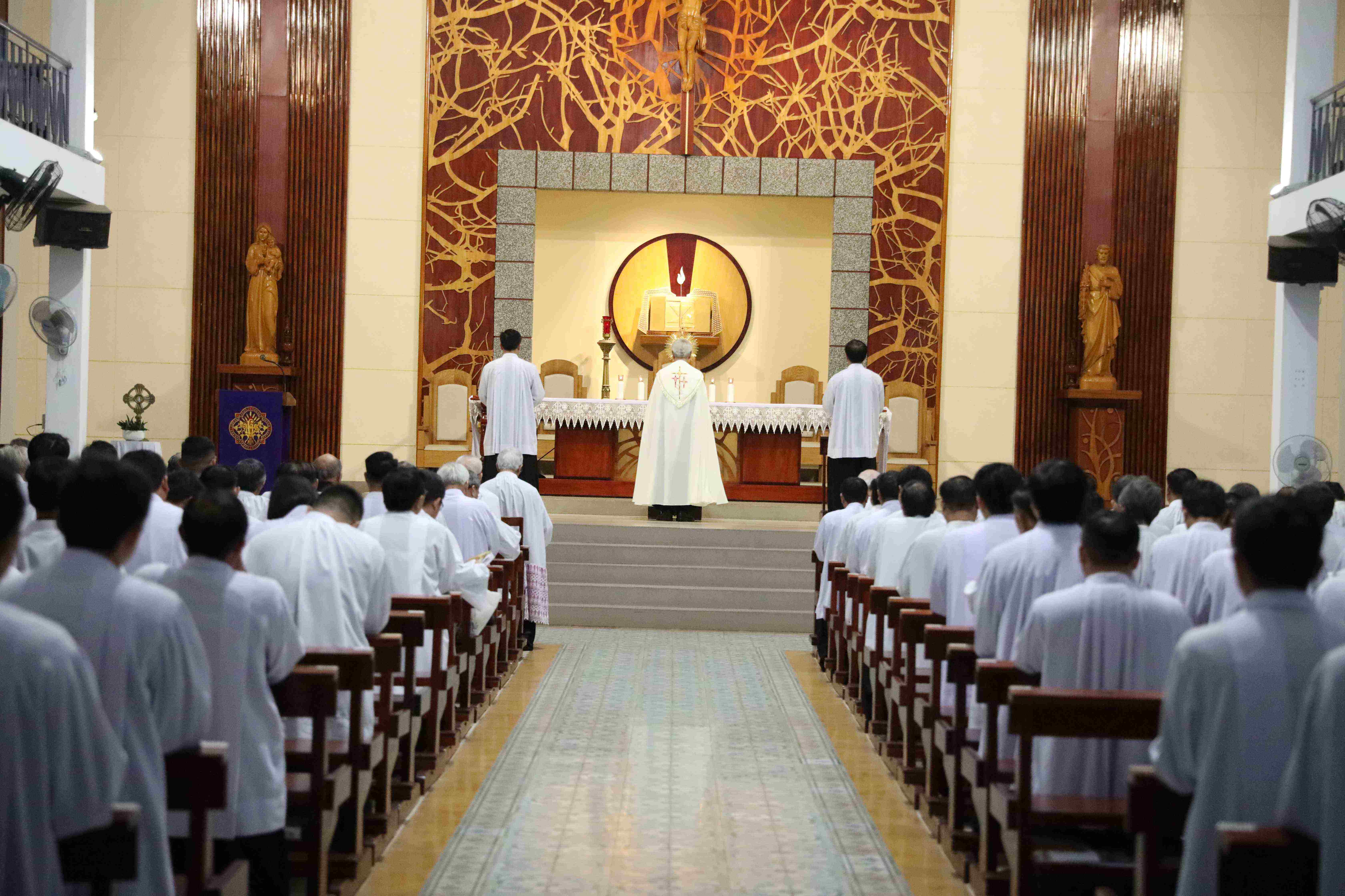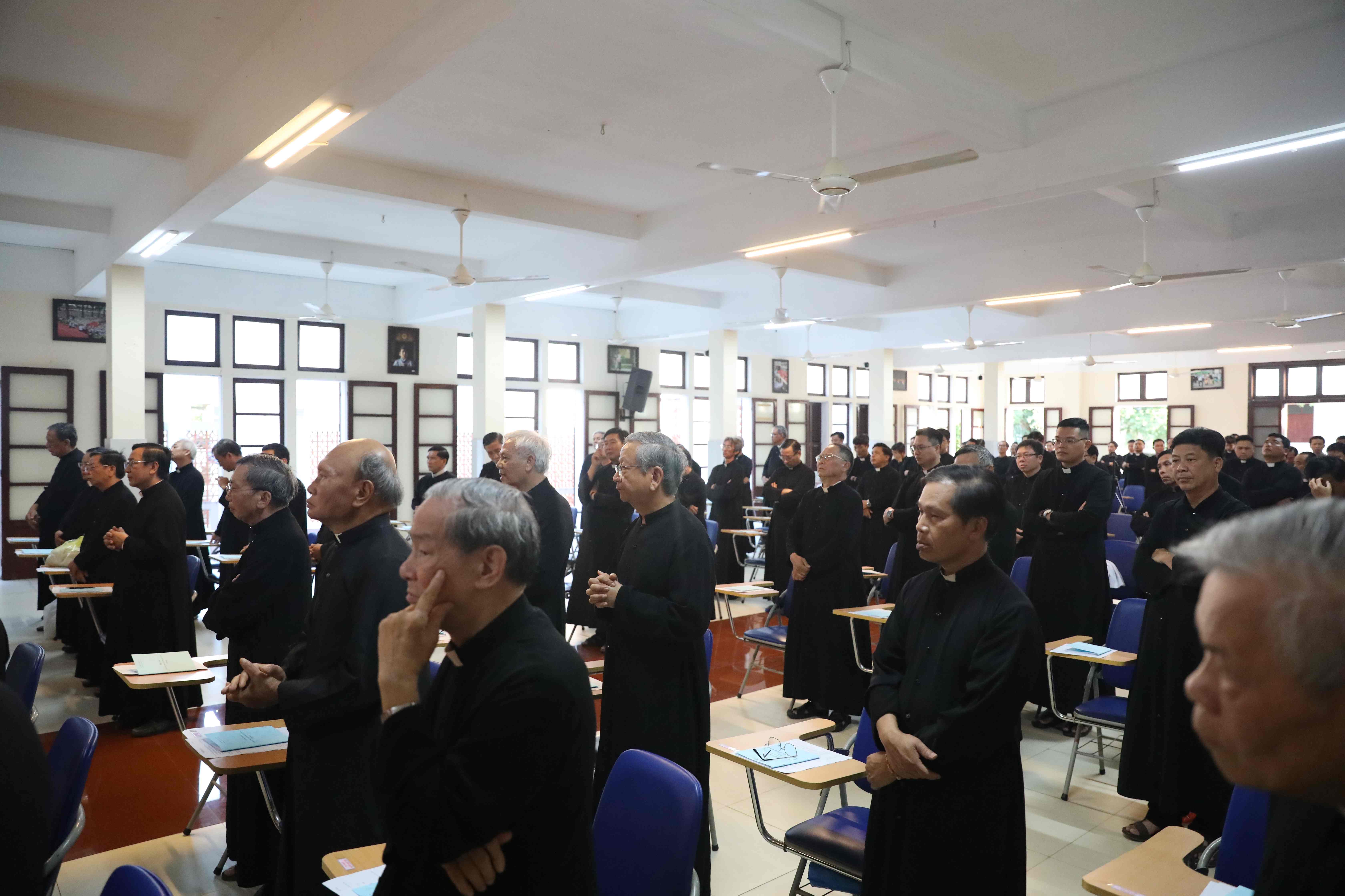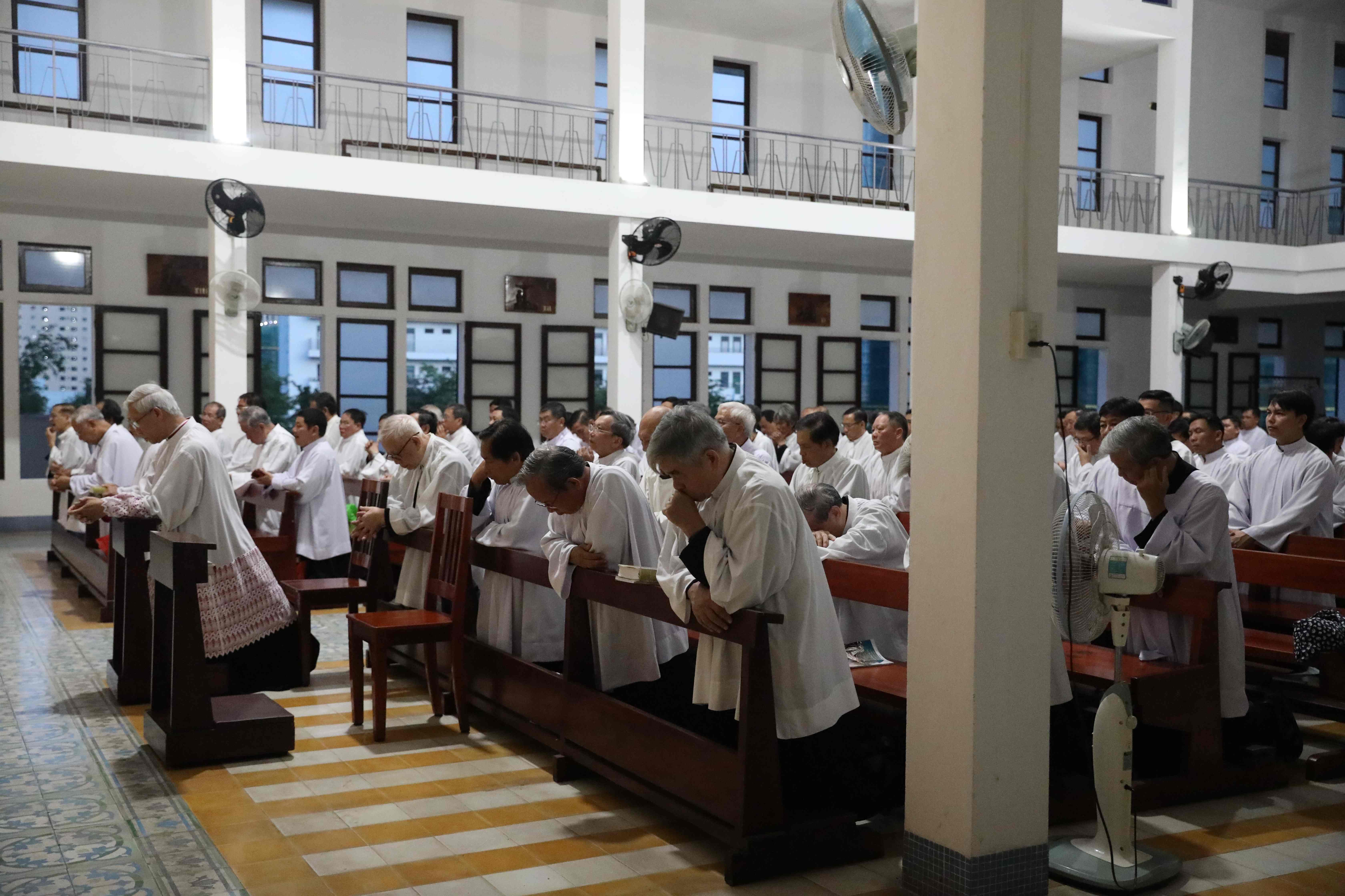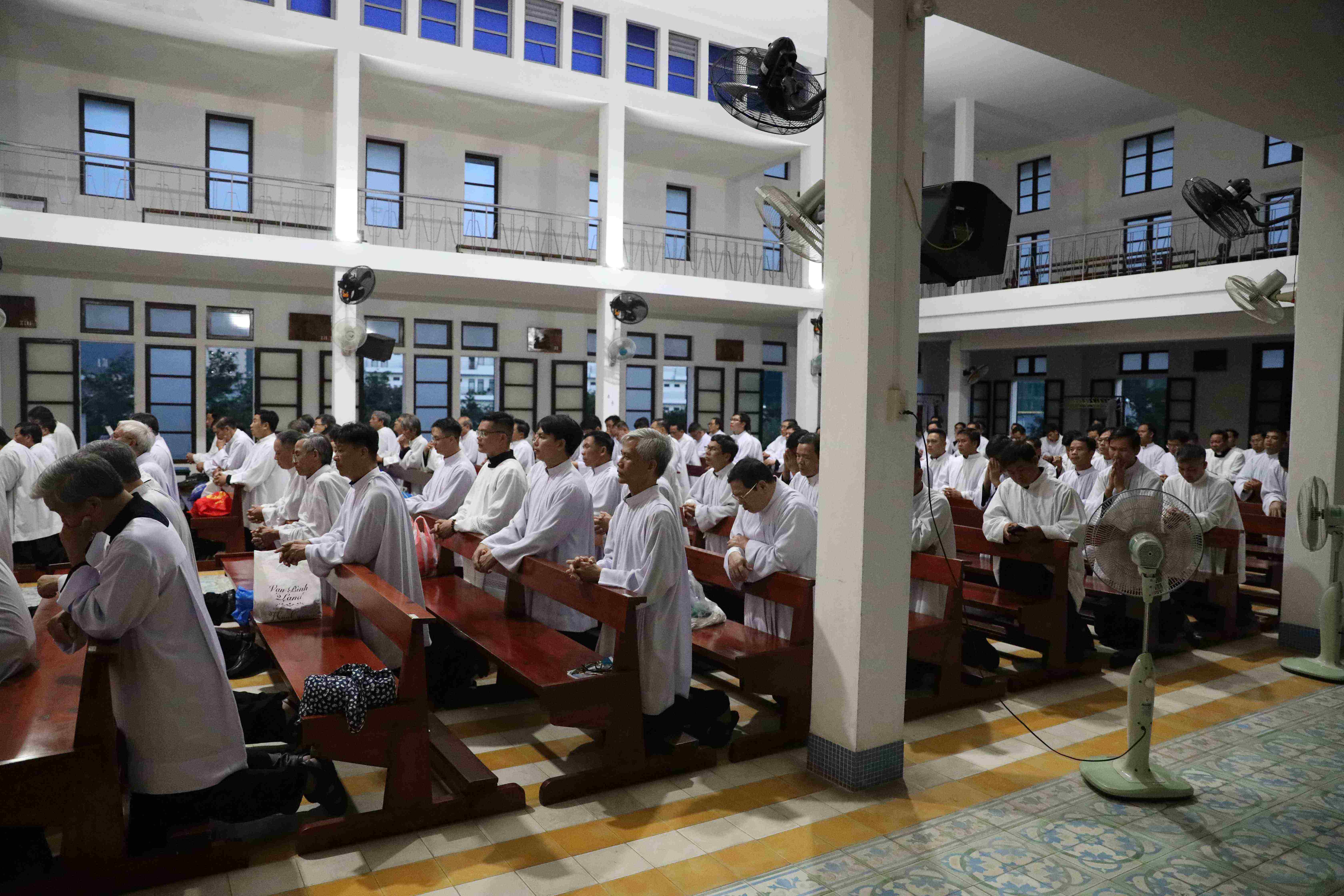 Đúng 17 giờ 00, cha Tổng Đại diện thay mặt linh mục đoàn chào Đức cha Giảng phòng và Đức cha Giáo phận tại Hội trường Chủng viện. Sau đó, các cha tham dự giờ Chầu Thánh Thể và Kinh Chiều.