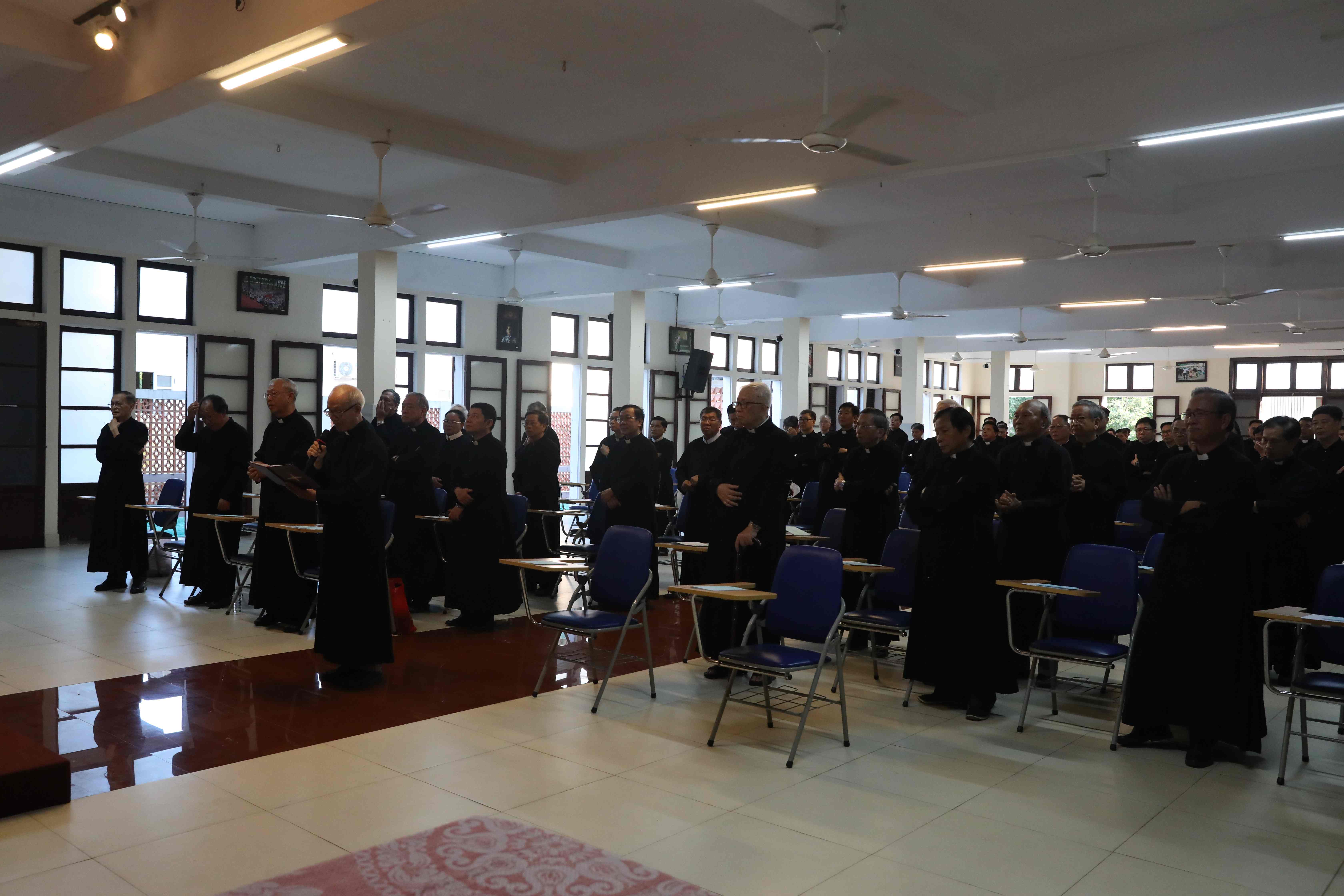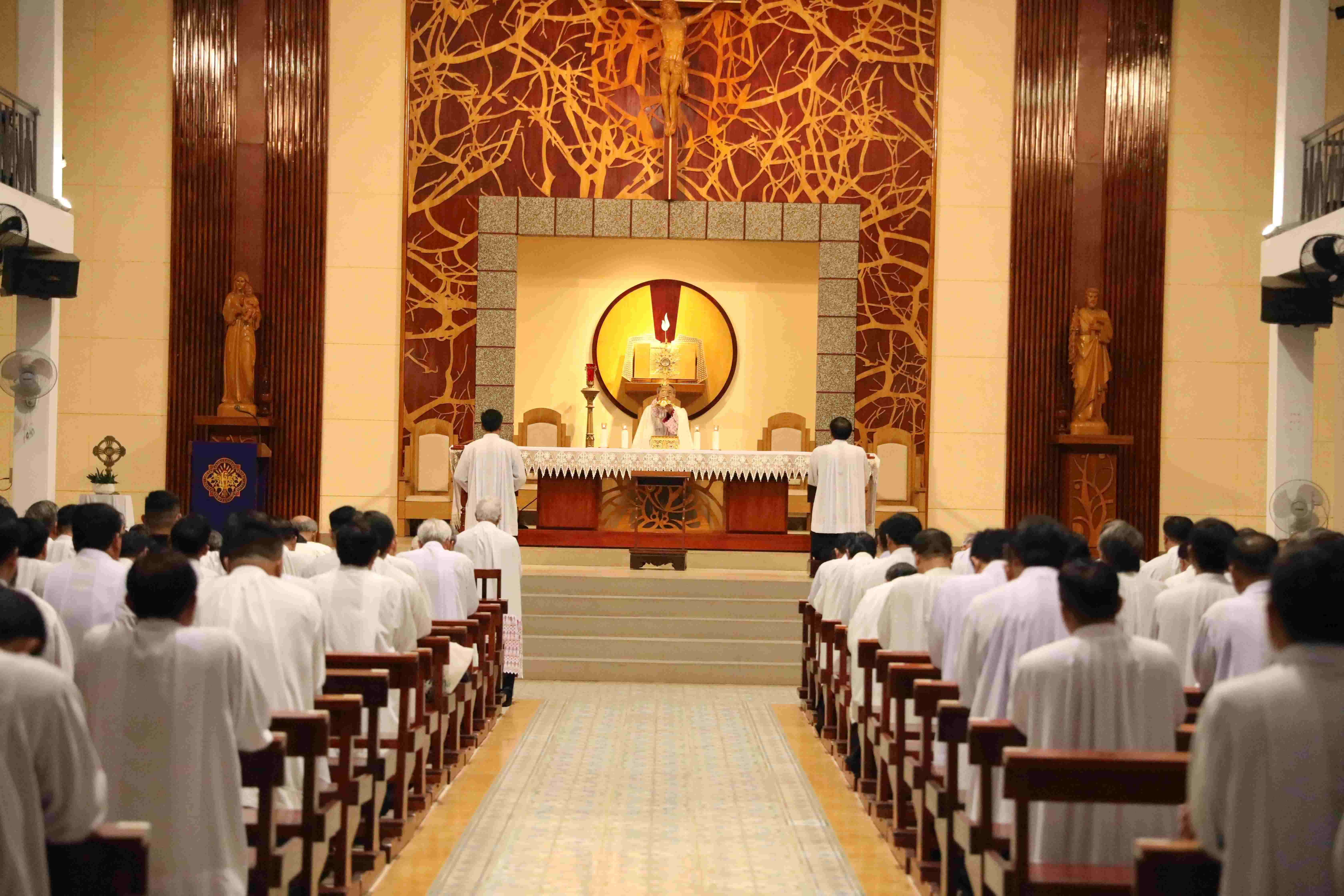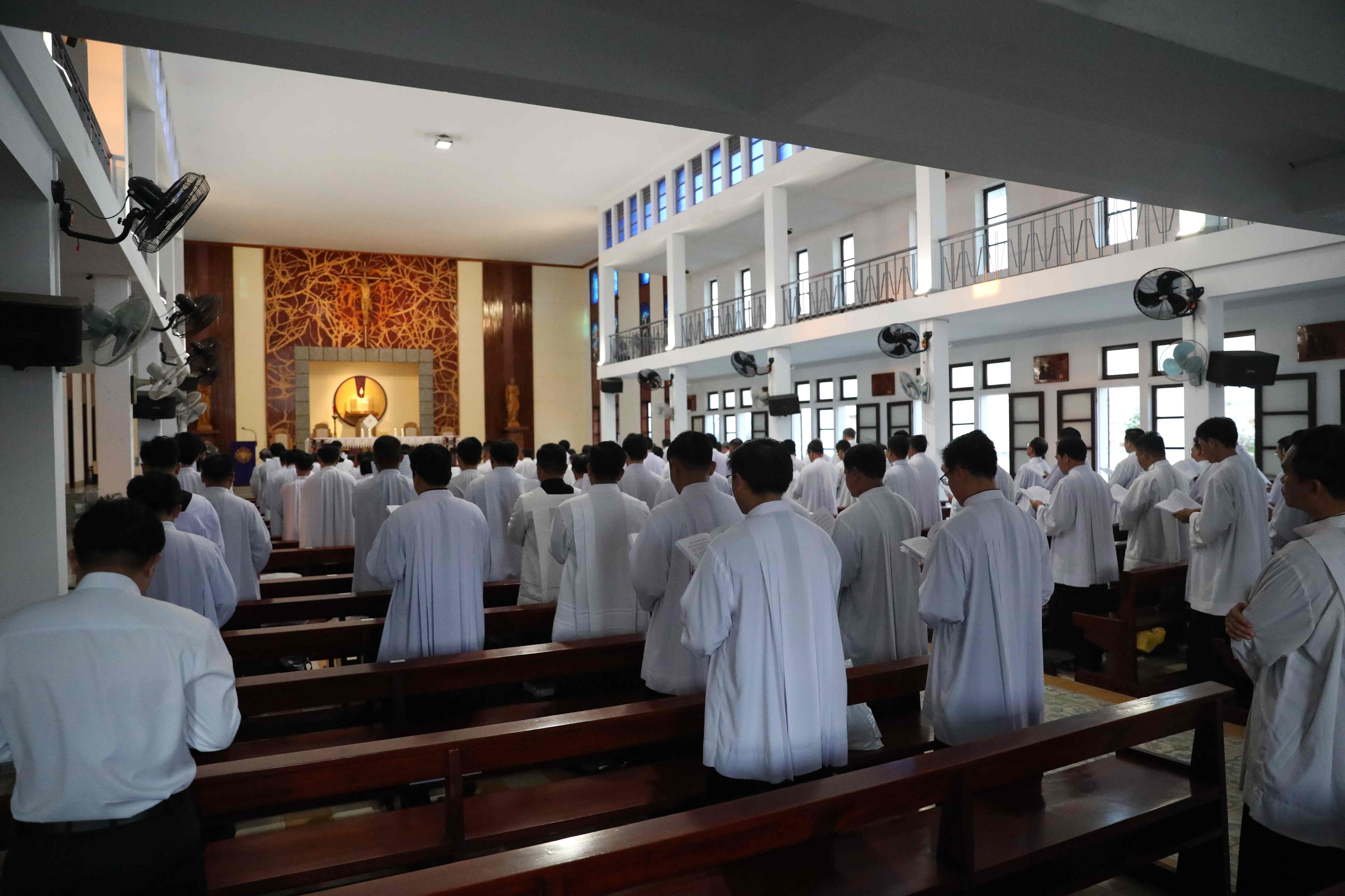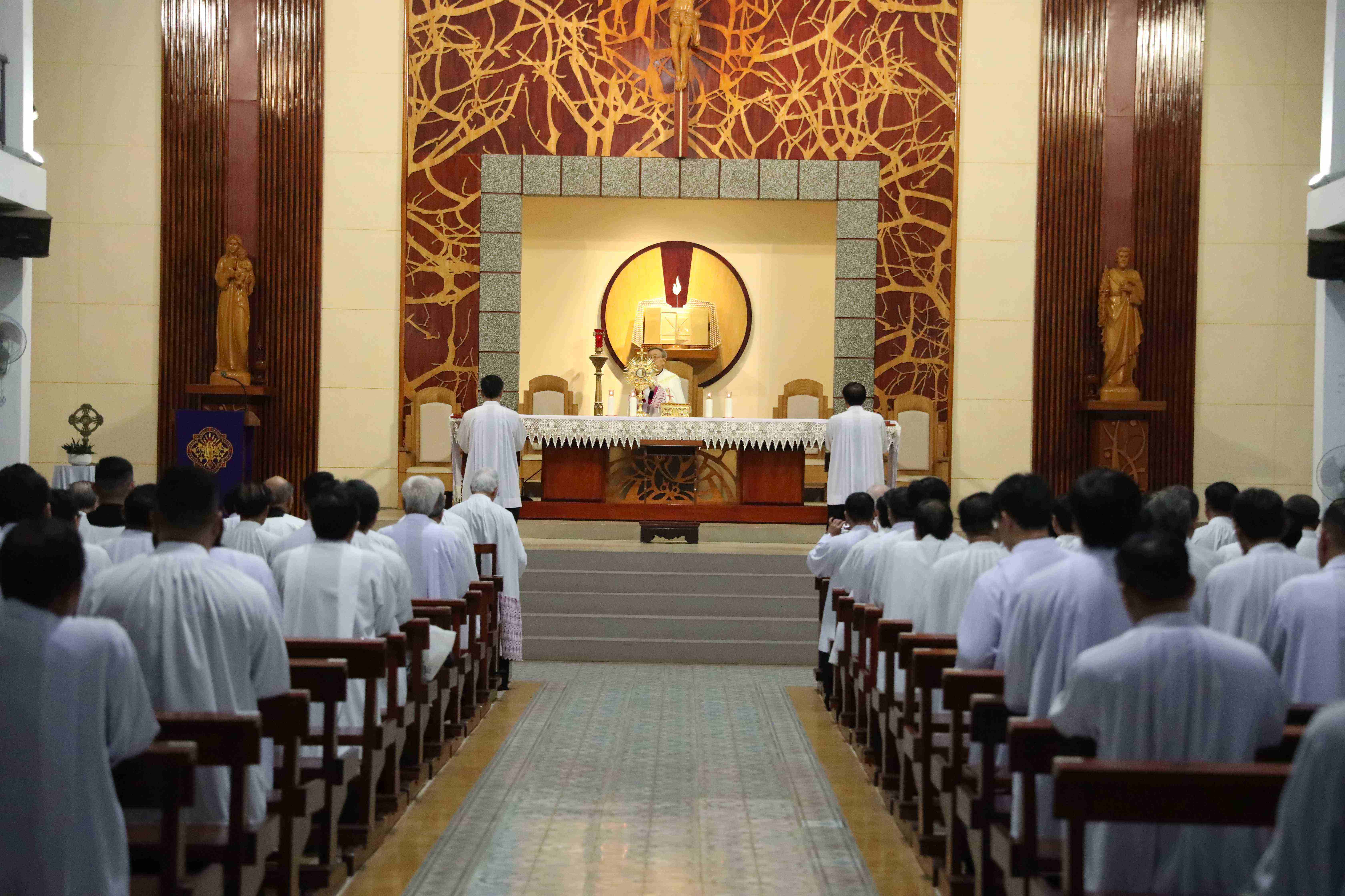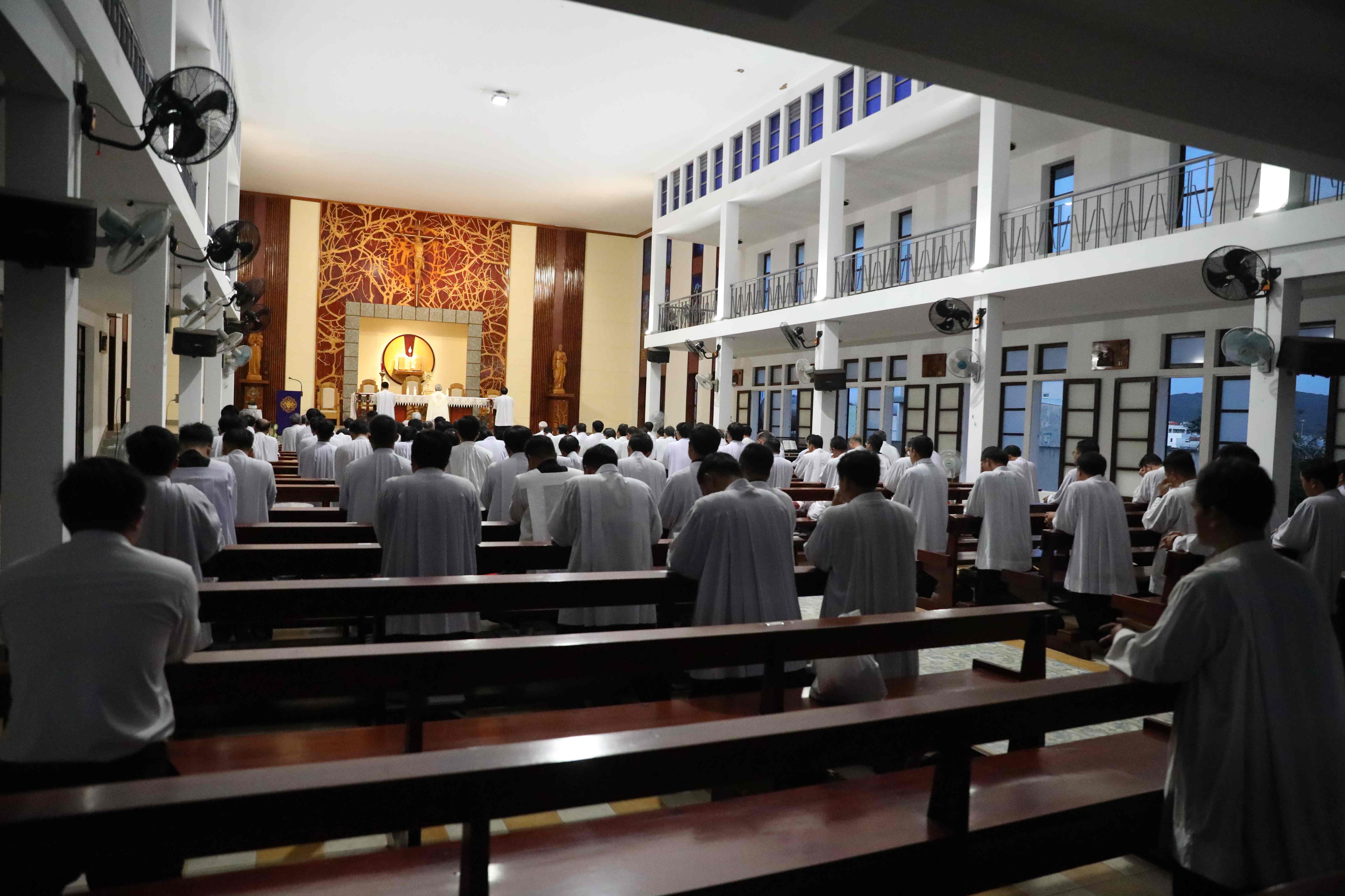 Đúng 17 giờ 00, cha Tổng Đại diện thay mặt linh mục đoàn chào Đức cha Giảng phòng và Đức cha Giáo phận tại Hội trường Chủng viện. Sau đó, các cha tham dự giờ Chầu Thánh Thể và Kinh Chiều.