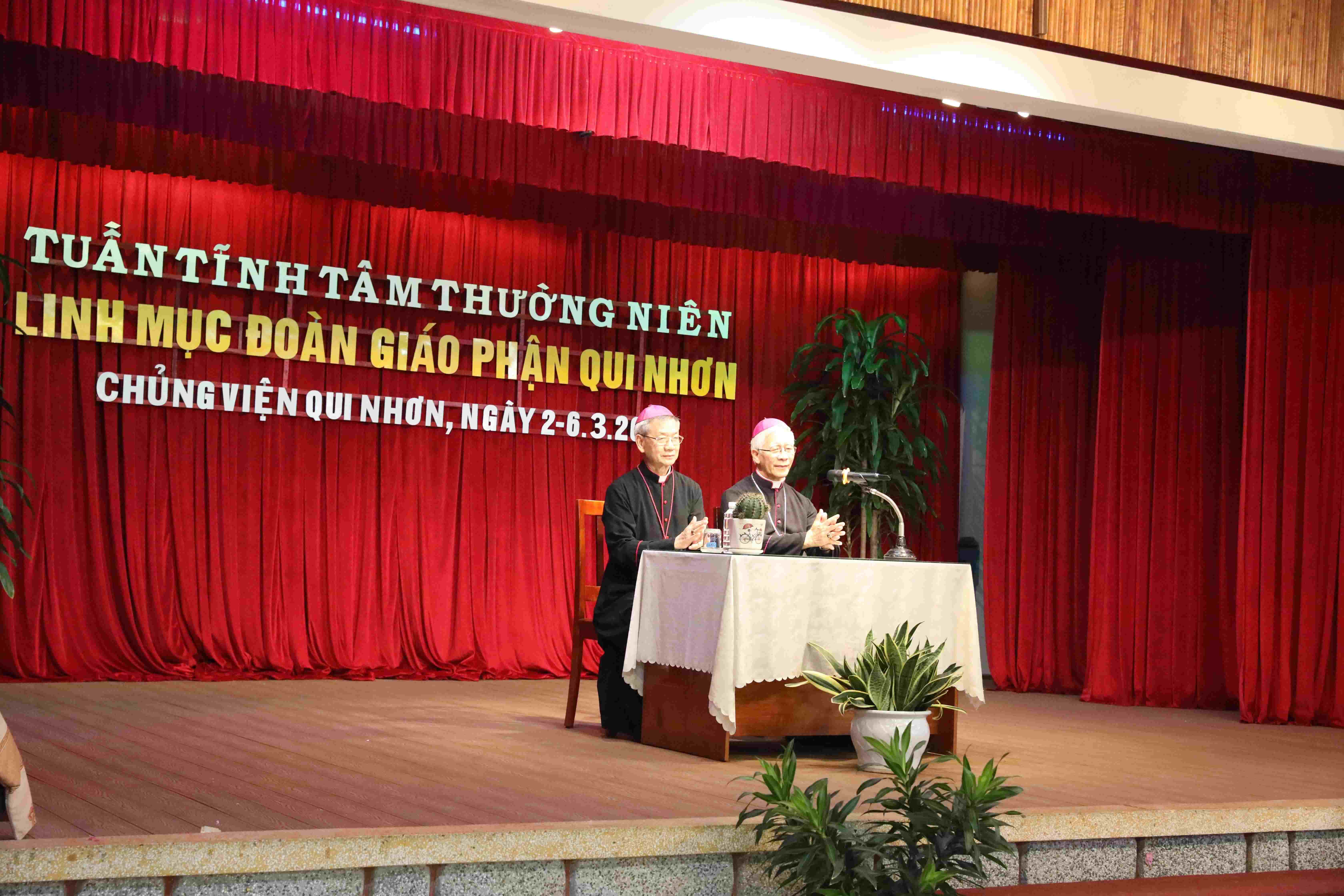 Giảng phòng là Đức cha Phêrô Huỳnh Văn Hai, Giám mục Giáo phận Vĩnh Long. Tham dự tuần tĩnh tâm có Đức cha Matthêô Nguyễn Văn Khôi, Giám mục Giáo phận Qui Nhơn; cha Giuse Trương Đình Hiền, Tổng Đại diện; cùng đông đủ quý cha đang phục vụ tại các giáo xứ.
