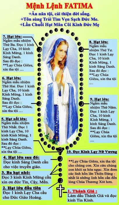 - Mỗi chục kinh: hạt lớn 1 Kinh Lạy Cha, 10 Kinh Kính Mừng, 1 Kinh Sáng Danh, Kinh Fatima, nên có ít phút thinh lặng suy niệm về mầu nhiệm đó.