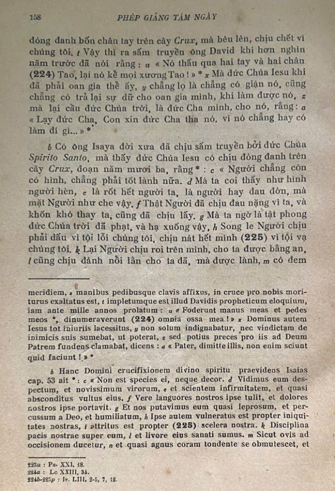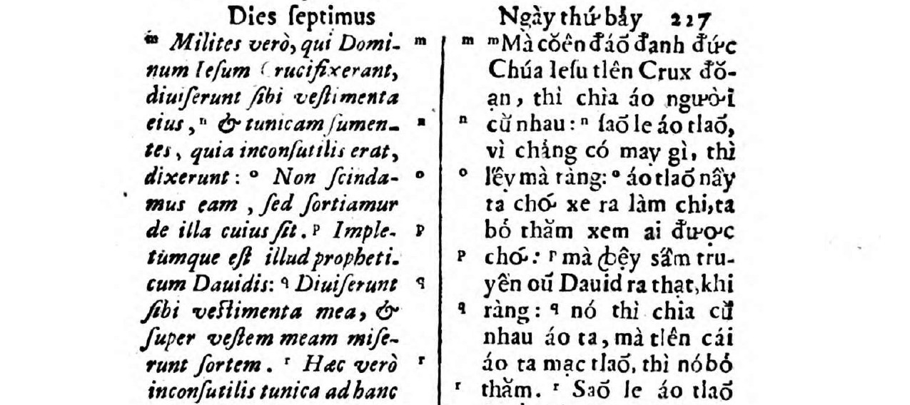 “Mà quân đóng đanh Đức Chúa Iesu trên Crux đoạn, thì chia áo Người cùng nhau, song le áo trong, vì chẳng có may gì, thì lấy mà rằng: ‘Ao trong này ta chớ xé ra làm chi, ta bỏ thăm xem ai được chớ!’ Mà vậy sấm truyền ông David ra thật khi rằng: ‘Nó thì chia cùng nhau áo Ta, mà trên cái áo Ta mặc trong, thì nó bỏ thăm’". |